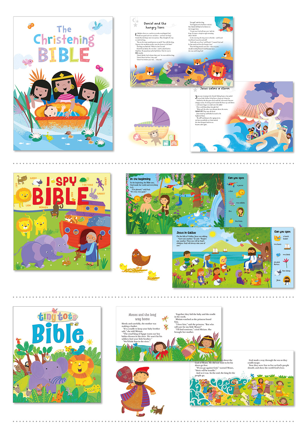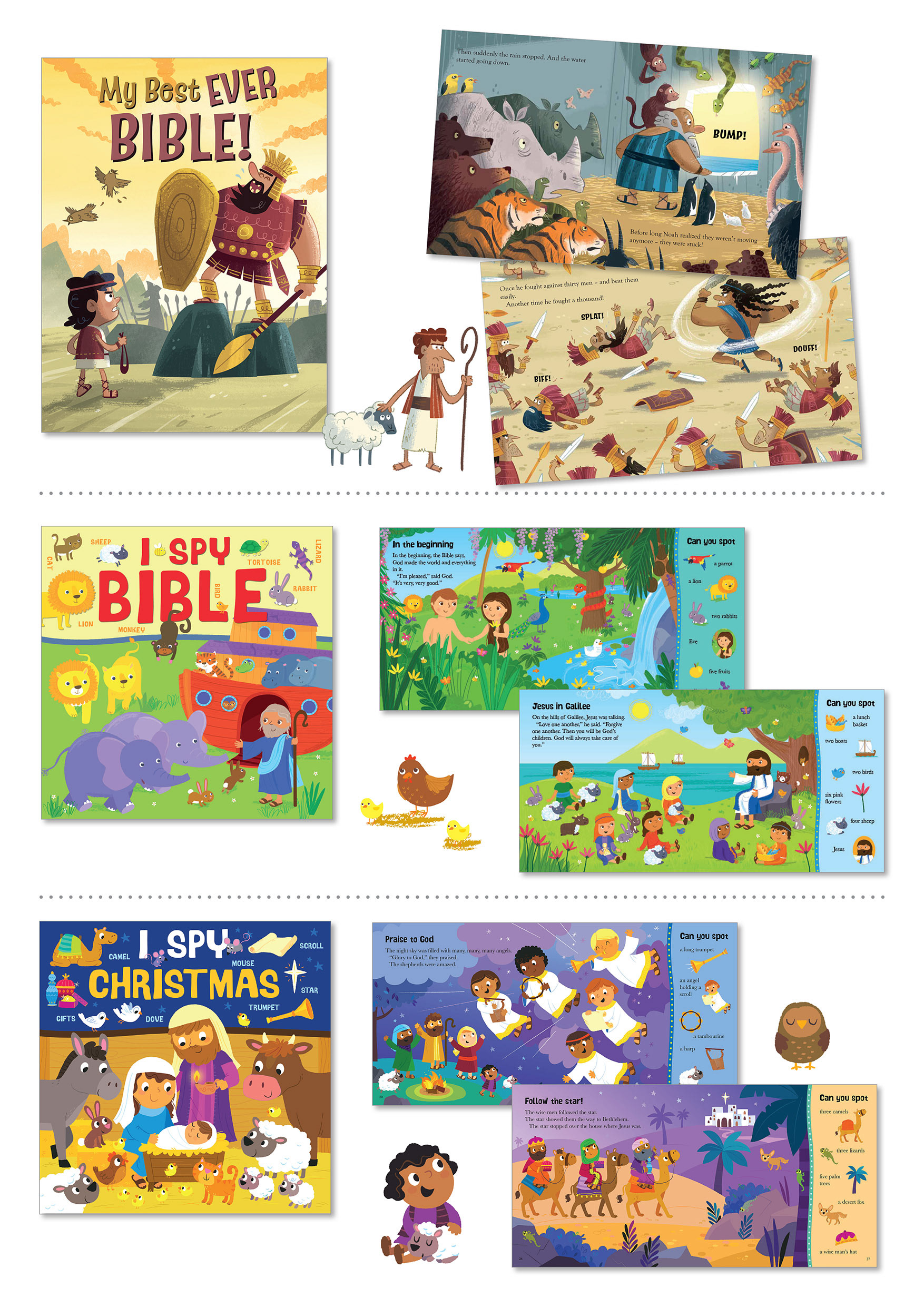 Here are some examples of the Children's Bibles I have worked on. They are a variety of illustration styles to appeal to different markets and age-groups. I have enjoyed the process from concept, commissioning, layout, art direction, project management through to final production. Working in partnership with publishing teams, packagers and illustrators to produce engaging, highly illustrated, Bibles for the trade.